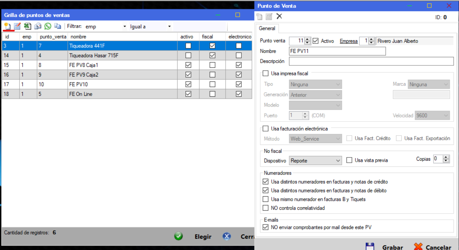 En la grilla se muestran los puntos de venta actuales, para configurar uno nuevo vamos a "Nuevo" en la esquina superior izquierda y en la ventana emergente completamos los datos que correspondan, podemos asignarle una descripción seleccionar una impresora fiscal, seleccionar si usa facturación electrónica y el método, o si es no fiscal y genera reportes, si envía mails de cada comprobante en este punto de venta, etc.