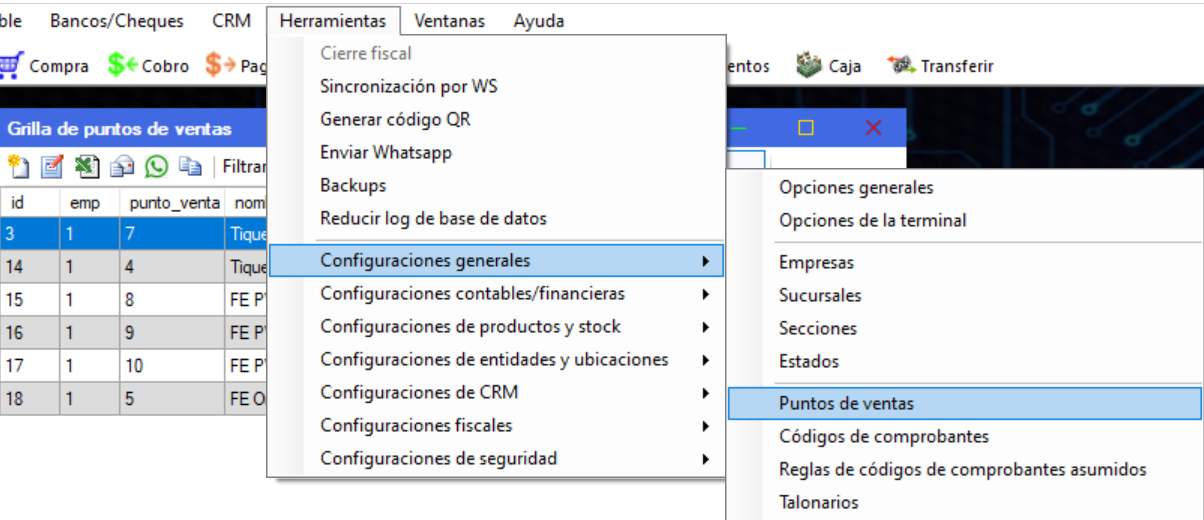 Para crear un nuevo punto de venta debemos ir a "Herramientas", "Configuraciones generales" y "Puntos de ventas".